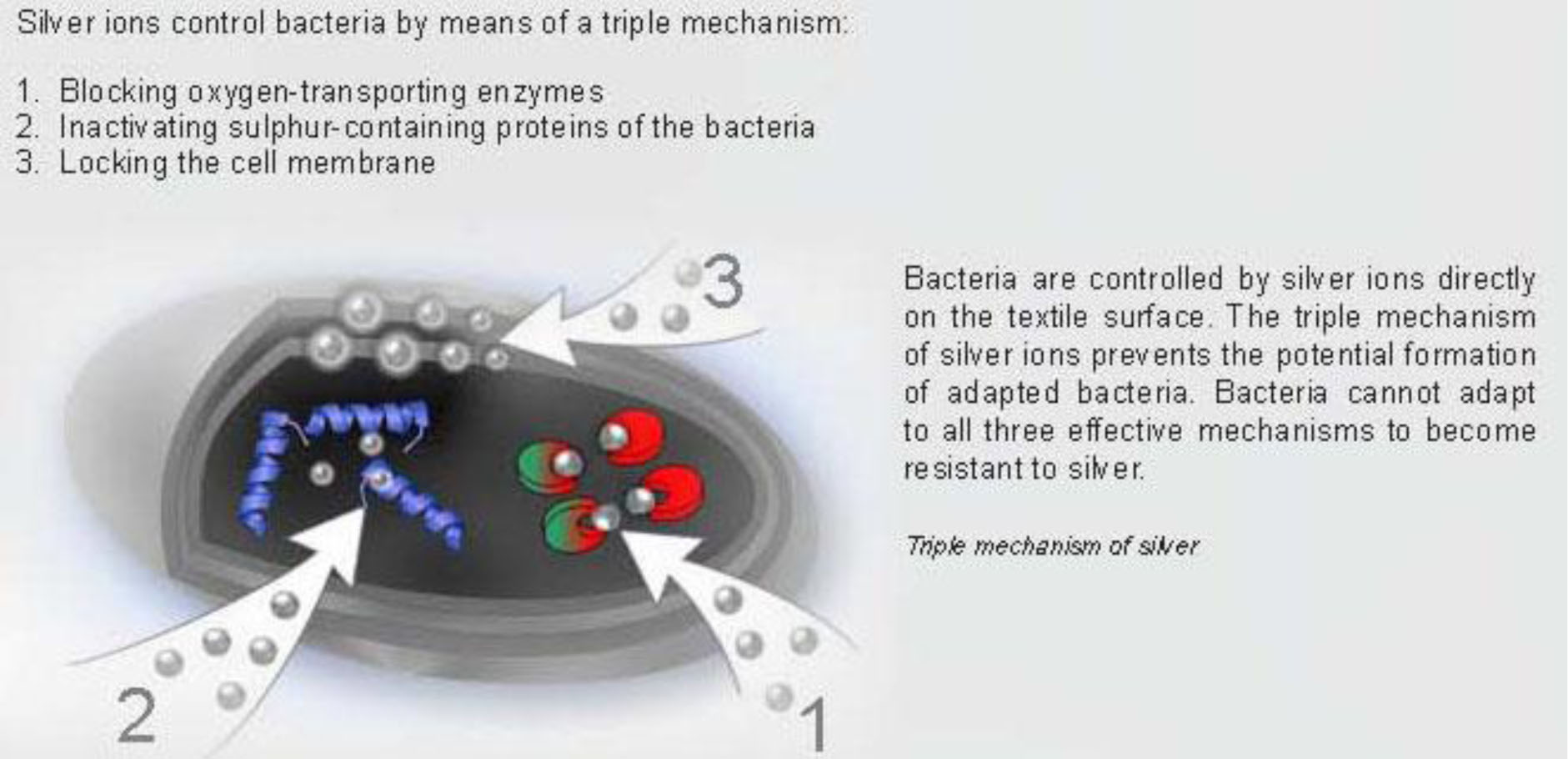 ผลิตภัณฑ์สิ่งทอที่นำไปเป็นชุดปฏิบัติงาน ไม่ว่าจะมาจากเส้นใยธรรมชาติ หรือเส้นใยสังเคราะห์ จะเกิดกลิ่นอับชื้นไม่พึงประสงค์ หลังจากมีการใช้งานในช่วงระยะเวลาหนึ่ง ความชื้นและอุณหภูมิที่เหมาะสมบนร่างกายมนุษย์ เหมาะสมอย่างยิ่งสำหรับเชื้อแบคทีเรีย เมื่อแบคทีเรียมีการย่อยสลาย เหงื่อที่อยู่บนร่างกายเราจะทำให้เกิดกลิ่นอันไม่พึงประสงค์ การตกแต่งสารต้านเชื้อแบคทีเรีย SILVER PLUS จะทำให้ปัญหานี้หายไป โดยสารที่เป็นตัวออกฤทธิ์ ใน SILVER PLUS จะเป็น SILVER ION (AG+) ซึ่งเกาะอยู่บน TITANIUM DIOXIDE เมื่อร่างกายเรามีความชื้น SILVER ION จะหลุดออกจาก TITANIUM DIOXIDE เพื่อทำหน้าที่ตัดวงจรไม่ให้แบคทีเรียเกิดการเจริญเติบโต สุดท้ายจะไม่มีการขยายตัวเพิ่มของแบคทีเรียขณะที่แบคทีเรียตัวเก่าก็ตาย จึงทำให้สามารถแก้ไขกลิ่นอับชื้นไม่พึงประสงค์ที่เกิดขึ้นได้