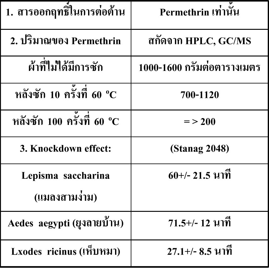 Vectorsผลิตภัณฑ์ชุดเครื่องแบบผ้าสีลายพรางดิจิตอล IR ป้องกันยุงกัด เริ่มจากการคัดเลือกสารเคมี ที่มีองค์ประกอบของสารPERMETHRINซึ่งมีคุณสมบัติในการป้องกันยุงกัดได้ทำการทดสอบและทดลองสารเคมีเพื่อให้ได้คุณสมบัติที่ทางกองทัพต้องการคือ ต้องคงทนถาวร ทนทานต่อการซักได้ดี มีประสิทธิภาพการป้องกันยุงกัดตลอดอายุการใช้งานและให้เป็นไปตามมาตรฐานของ NATO ARMY คุณสมบัติของ Permethrin ในสิ่งทอ 1600 มิลิกรัมต่อตารางเมตร Permethrin
